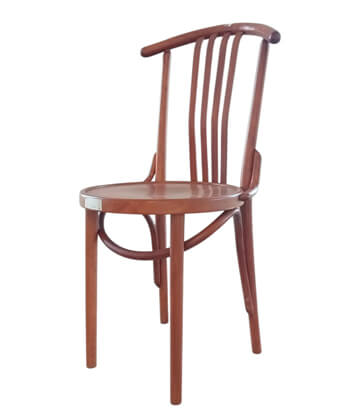 Silla de madera con respaldo y remate en curva, con inserción de los cuatro listones que forman el respaldo. Barra inferior con forma orgánica de una pieza. Un modelo muy peculiar Conocer más